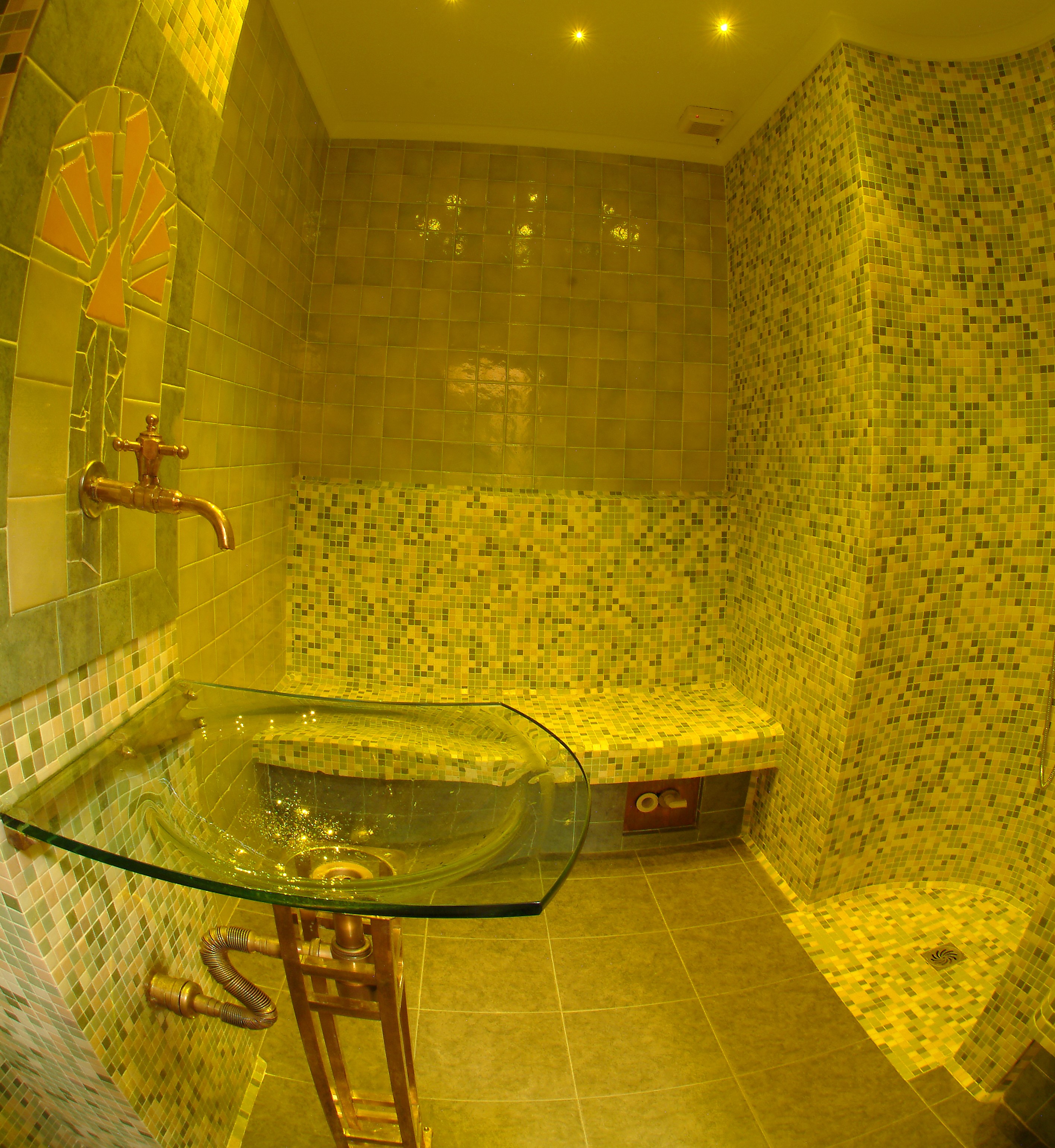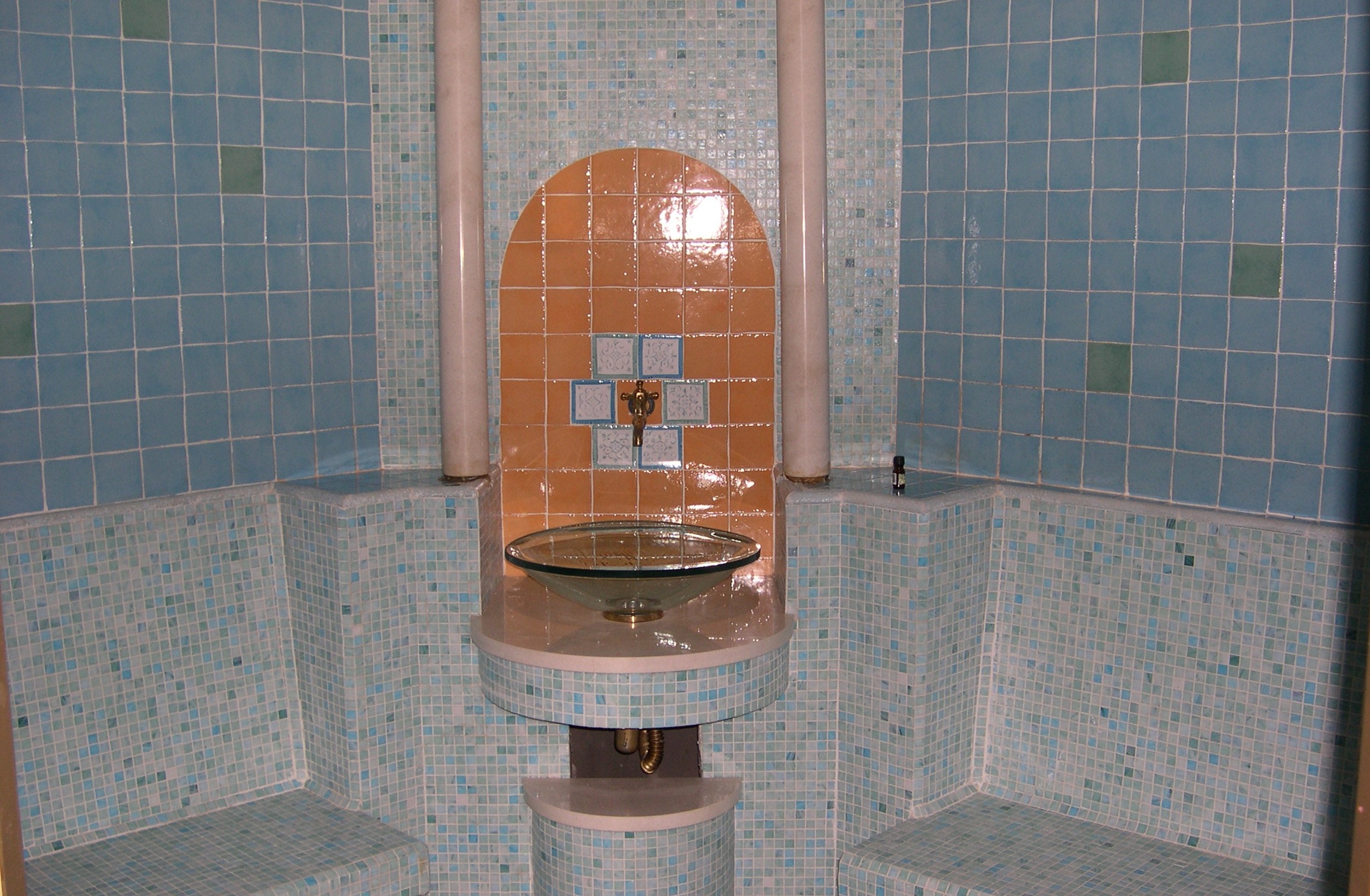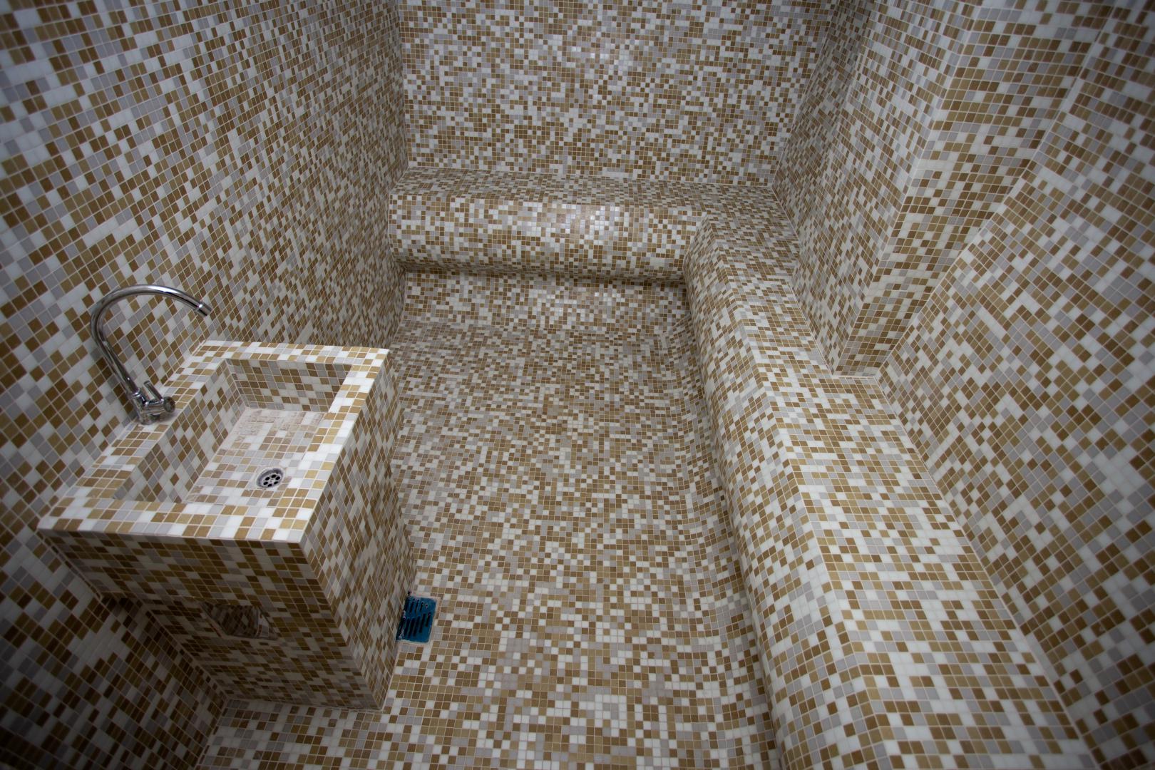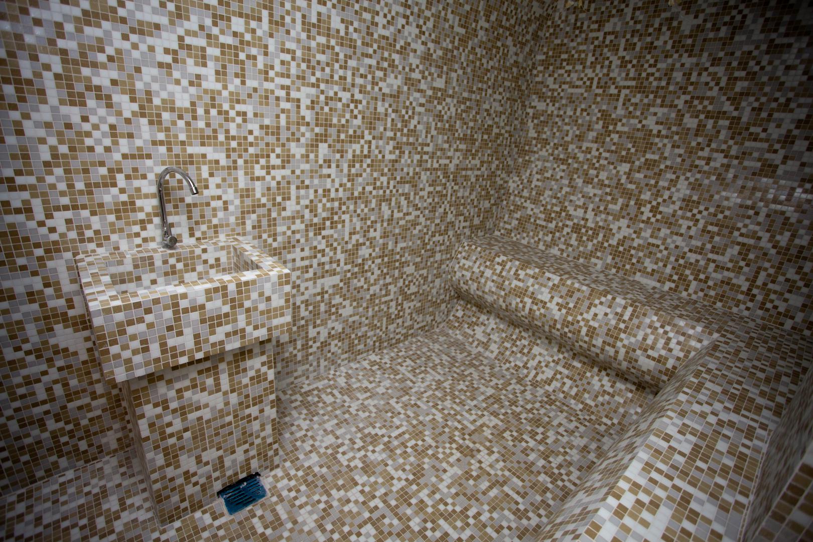 The Turkish version of a steam bath in which the air humidity is high and the temperature is between 45°C and 50°C. Inside the cabin there are heated marble benches for sitting and lying down, and in the middle is a sink with cold water for cooling down.